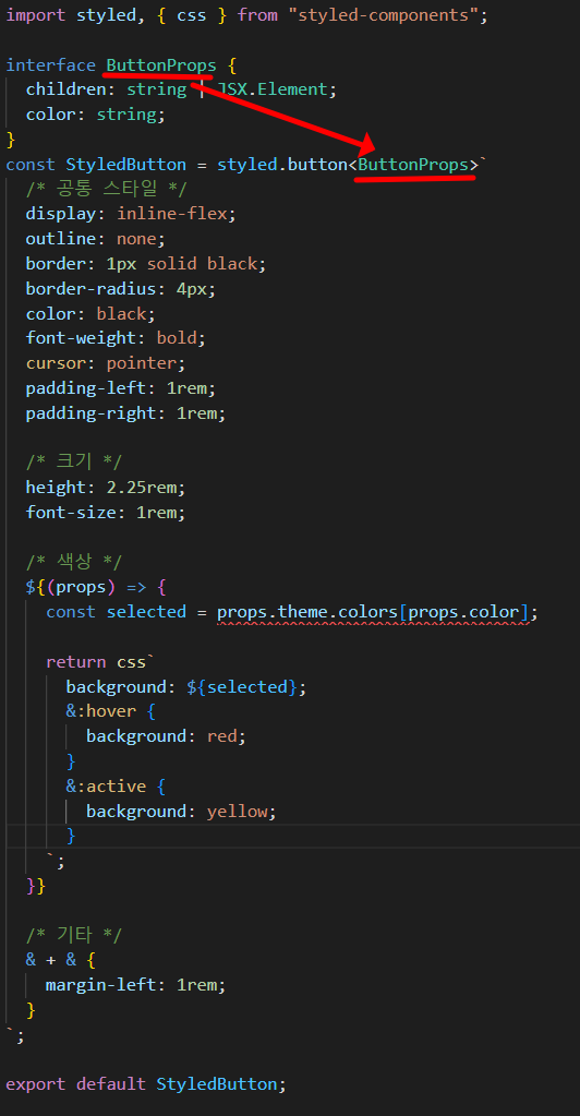 그리고 버튼의 스타일 컴포넌트에 버튼 color, 버튼 글자인 children을 넘겨준다.