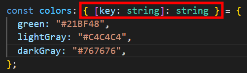 No index signature with a parameter of type 'string' was found on type '{ green: string; lightGray: string; darkGray: string; }'